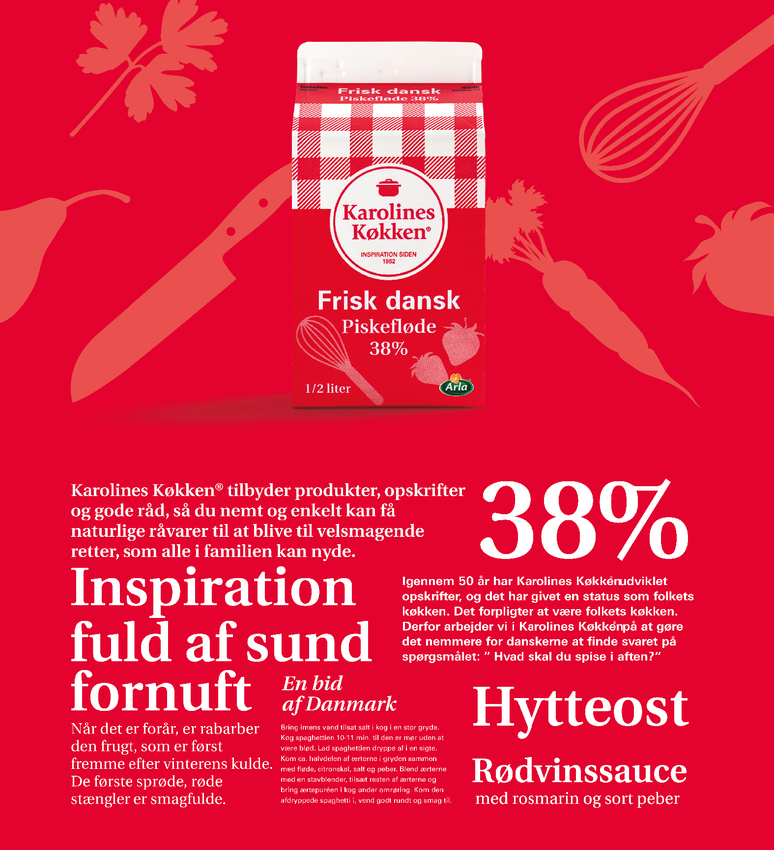 Karolines Køkken (Karoline’s Kitchen) is an Arla brand with a remarkable history. The brand originally started out as an actual kitchen in 1962, when the Danish Dairy Board asked two Home Economics teachers to test a number of recipes for a new cookbook. These recipes became the first in the rapidly growing and immensely popular series of cookbooks, loose-leaf recipes, and products.