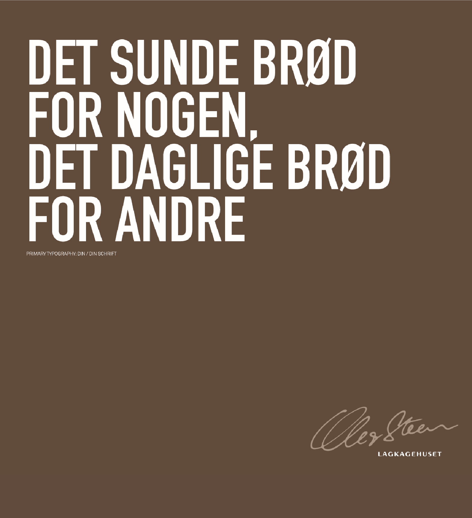 The key elements of the visual identity are the stringent and graphically restrained logo and the softer, personal signature. It felt natural to let Ole Kristoffersen’s signature play a main part, as a personal touch, and as a seal of approval. In 2009 we revised the visual identity by changing the signature to Ole & Steen, in order to embrace the Skallebæk bakery.