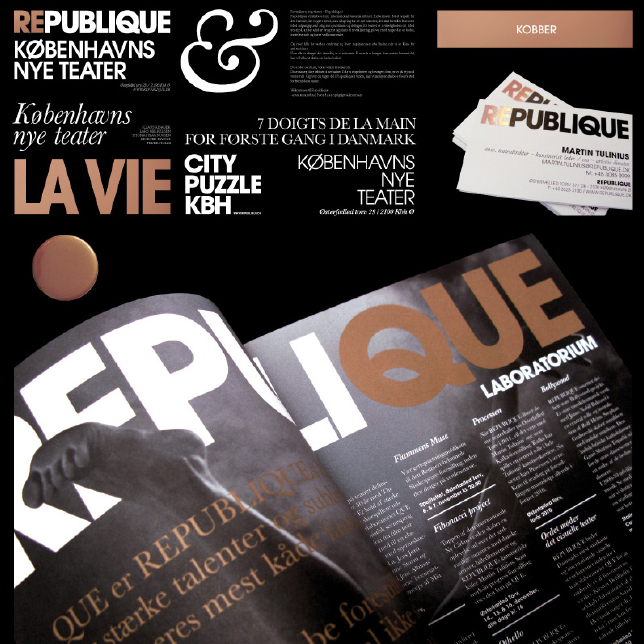 The use of copper as the corporate REPUBLIQUE colour is inspired by the copper roofs of Copenhagen. The fluorescent pink was chosen for first season to create a powerful, visual synergy between image posters and the posters for the individual performances. To ensure a clear recognition of the theatre the circle appears on all posters in the exact same size and place, thus allowing constant change in the artistic expression from season to season. The brand universe allows the theatre to express its vision in the presentation of every play, so that every story becomes a part of the larger REPUBLIQUE story.